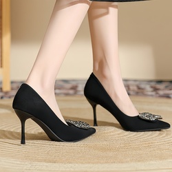 Pumps sexy en daim noir avec strass, bout pointu, talon aiguille, design fermé, pour mariage, fête, antidérapant, talons hauts pour femmes